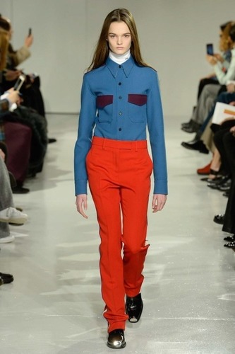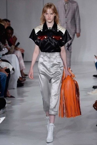 除了主線 Raf Simons 親自操刀以外,由 Luella Bartley 擔任設計總監的 Calvin Klein Jeans 似乎也在跟著 Raf Simons 的步伐,延續主線的設計風格,通過鮮明色系的撞色、軍樂服元素,以及西部牛仔靴,來表現出美國西部牛仔的服飾特點。